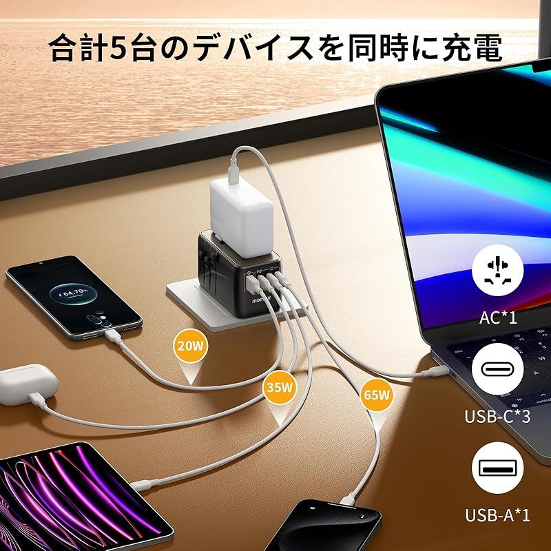 超高速の120 W出力 MOMAX 変換プラグ PD GaN 単ポート100 総出力120 W 急速充電 全世界対応 5台同時充電 3 USB C 1 QC A 海外用コンセント 海外変換プラグ BF O Aタイプ ヨーロッ 0