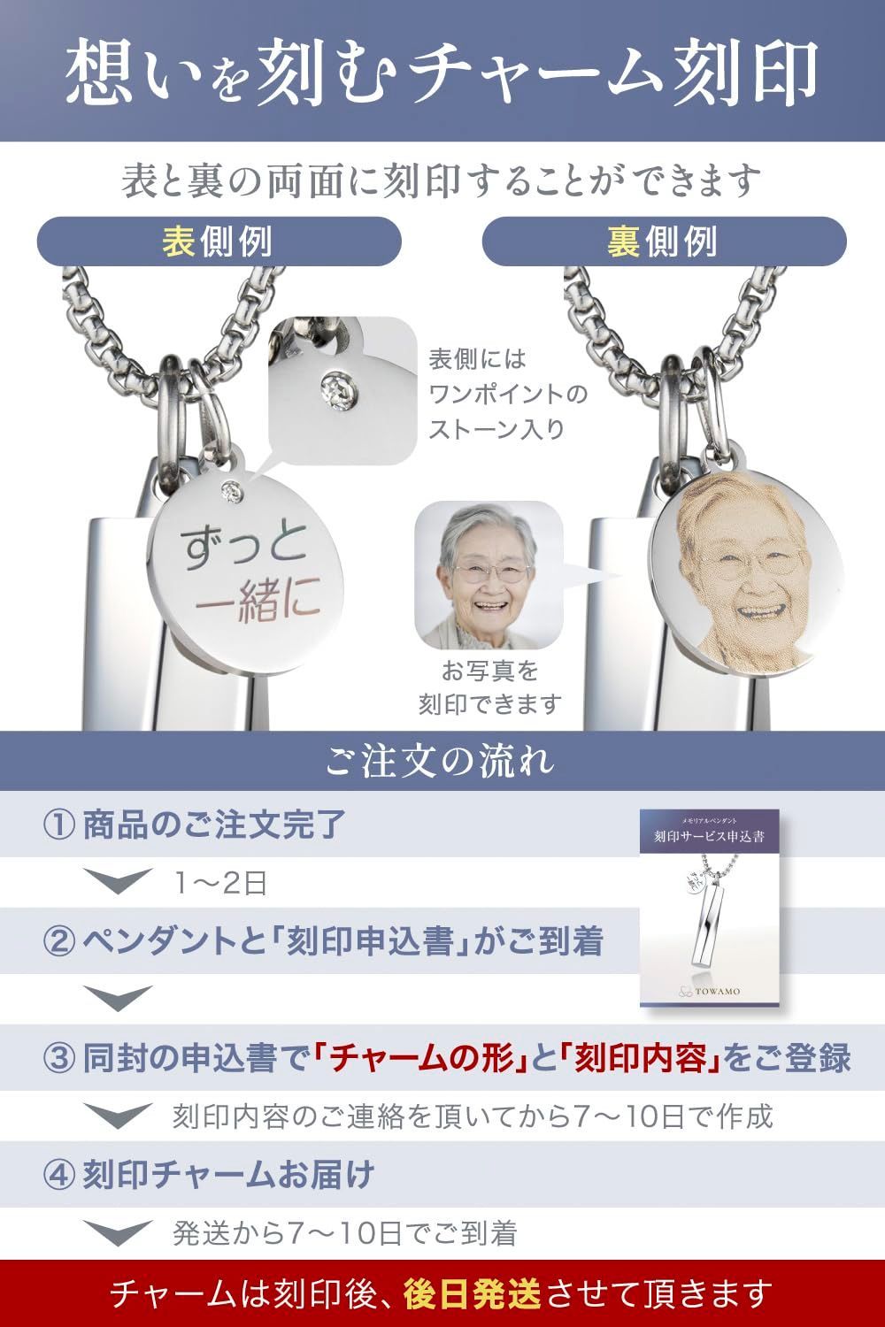 【刻印サービス申込書】が同封されており、お名前・日付け・メッセージ・お写真などご希望の刻印をスムーズに刻印のお申し込みすることができます。