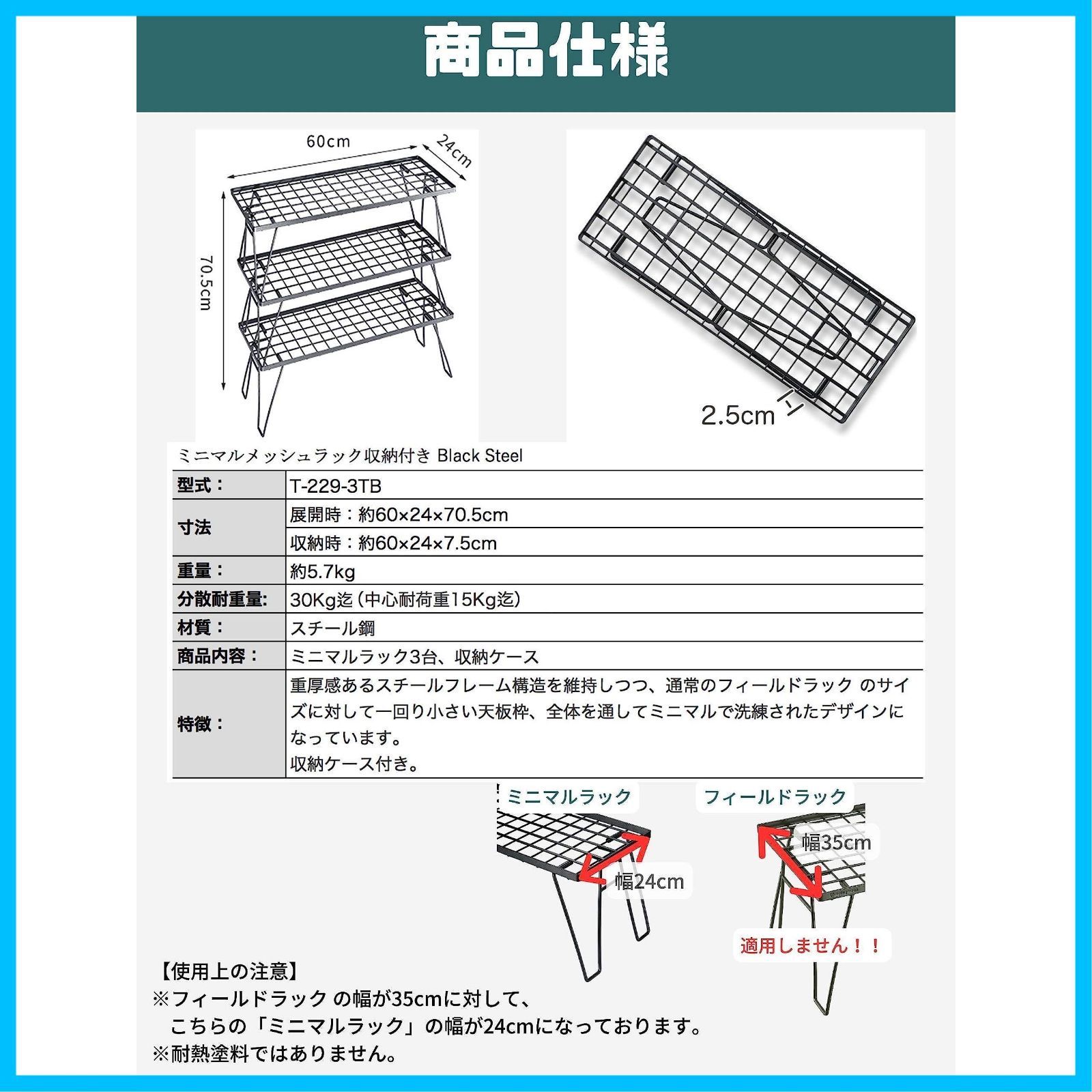 材質:スチール黒メッキ(こちらはミニマルラック 3脚の販売となっております。通常のフィールドラックより天板の幅が狭く、レイアウトが窮屈なキャンプスペースにも合わしやすいサイズになります)。
