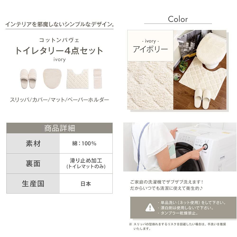 San-Luna トイレタリー 4点セット 【コットン パヴェ】 アイボリー 日本製 綿100% 滑り止め | トイレマット 55cm × 60cm トイレふたカバー スリッパ トイレットペーパーホルダー 洗える おしゃれ かわいい 綿 コットン 足元 足下 マット 55×60