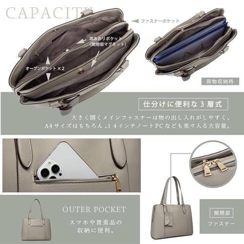 スケース付き3層式ビジネストートバッグ ?パスケース付きで仕分けに便利な3層式トートバッグ。?大きく開くメインファスナーは物の出し入れがしやすく、A4サイズはもちろん、ノートPCなども楽々入る大容量。?本革のような上質なPUレザーを使用し、高級感がありながらも、軽量を実現。?毎日のビジネスシーンで大活躍すること間違いなし!