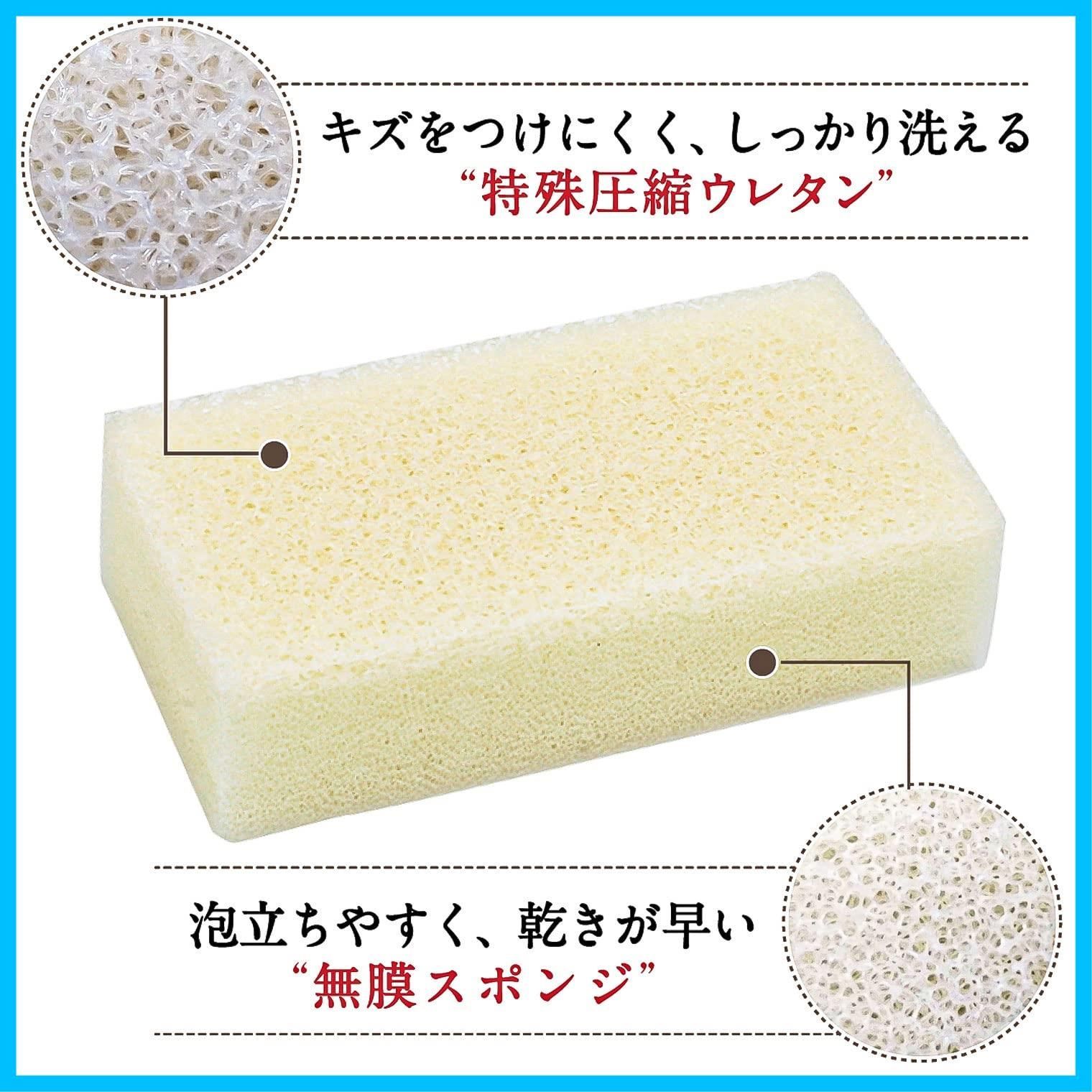 傷つけにくくしっかりと洗える特殊圧縮ウレタンのスポンジ。空気が通りやすく乾きが速い微セル無膜スポンジを使用。少量の洗剤ですぐにもこもこと泡立ち、しかも泡持ちもよいため洗剤の継ぎ足し回数も減らせます。洗い流すときの泡切れも良好。スポンジ自体の汚れも落としやすいので衛生的。研磨剤は使わず、骨格の太いエステルスポンジを使用することで、傷をつけず洗浄力をアップ。耐久力にも優れ、へたりにくいので従来のスポンジに比べ長持ちします。[サイズ]約6×3.2×高さ12cm(1個当たり)[重量]約9g(1個当たり)[耐熱温度]約90℃[素材・材質]ポリウレタンフォーム[生産国]日本