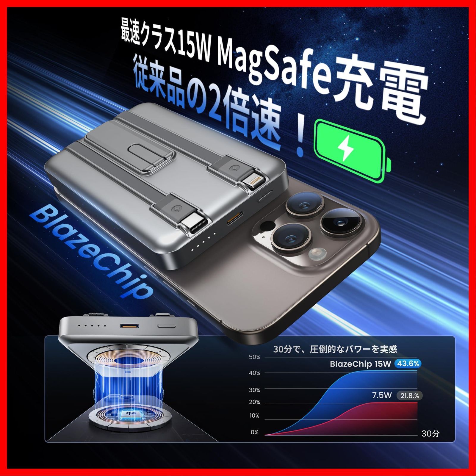 ??【最大15Wワイヤレス急速充電・MagSafe対応・超強磁力】たったの7.5W出力の「なんちゃって急速充電」とは一線を画す、最大15W出力の本格ワイヤレス充電を搭載。MagSafe対応でiPhone 12?16シリーズにピタッと吸着、わざわざケーブルを探す手間もゼロ。磁力は非常に強く、バッテリーだけを持ってもスマホが落ちないほどの吸着力を実現。※MagSafe非対応ケースをご使用の場合、磁力が弱くなる可能性があります。