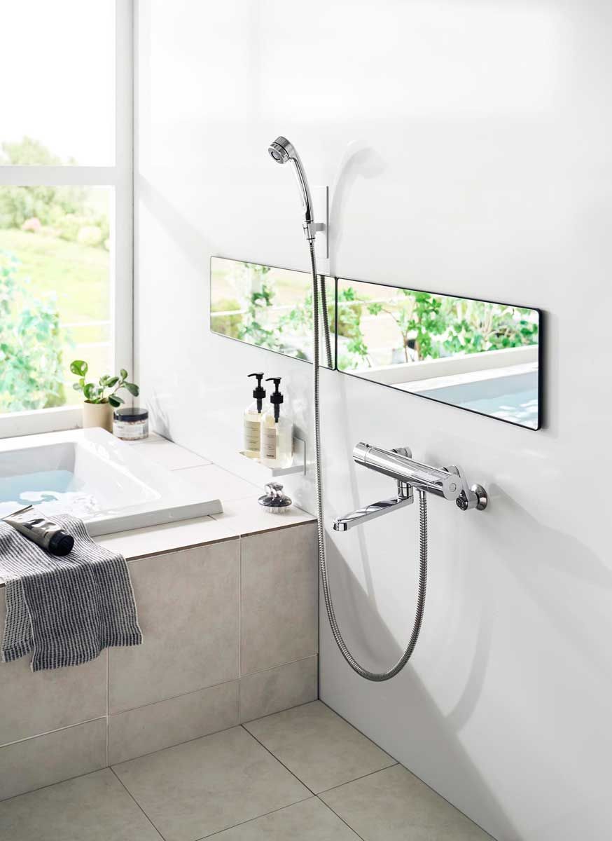 美しく、透明感があるロングサイズの角型ガラス製バスルームミラーです。フレームと壁の隙間に指を入れて取り外しやすい形状なので、お掃除がしやすく清潔に保てます。曇り止めフィルムを全面に粘着加工しているため、鏡面が曇らず快適にお使いいただけます。