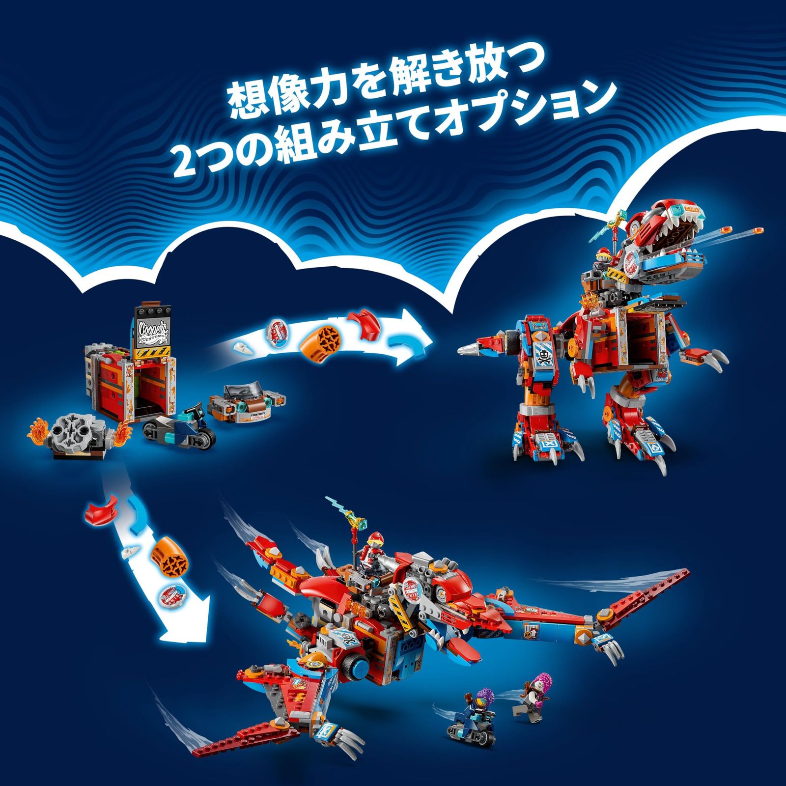 カッコいい恐竜ロボを組み立てて、瓶に閉じ込められたサンドマンの塔を取り返そう!クーパーがガラクタ置き場でドリームクラフトしたT-レックスは、しっぽを振り回して大あばれ。翼を広げて空を飛ぶプテロダクティルスにもできるよ。さあ、キミはどっちの恐竜から組み立てる?