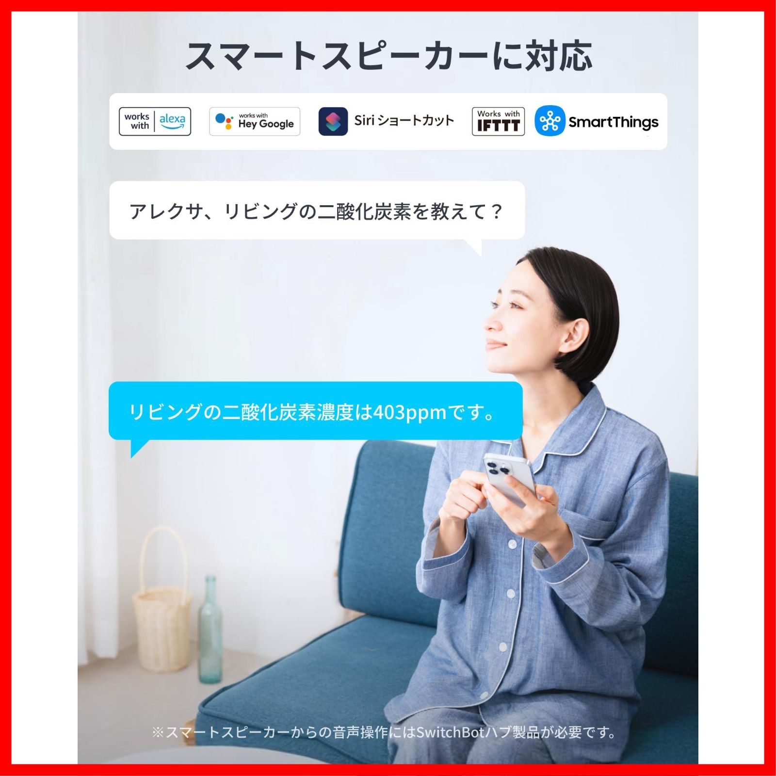 【音声で温湿度を確認】アレクサやGoogle アシスタントなどのスマートスピーカーと連携させると手が離せないときでも「アレクサ、温度を教えて」と声をかけるだけで温度や湿度の確認ができて便利です。※CO2濃度の確認機能は、 Alexaチームによる審査中のため、現時点ではご利用いただけません。