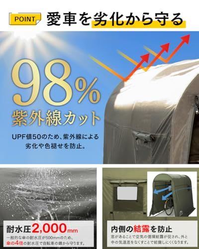 【大切なバイクや自転車を守るリーズナブルなシェルター】 PYKES PEAK( パイクスピーク )より、あなたの大切なバイクや自転車を雨風、日差し、埃から守り、快適な収納を実現します。幕の生地には、高機能ポリエステル生地を採用しています。 本体生地には、キャンプテントなどにも使用される抜群の撥水性と耐久性を兼ね備えた高機能ポリエステル生地を採用しています。シート裏面にPUコーティング加工された高耐水加工生地は、最大2,000mmの耐水圧を誇ります。シートの縫い目部にはシームテープ加工を施し、雨や水滴の侵入を軽減します。さらに、UV加工が施された生地は、UPF値50の高いUV防止効果を発揮し、大切な愛車を雨や湿気、太陽光からの紫外線などから保護し、愛車の劣化や色あせを最小限に抑えます。