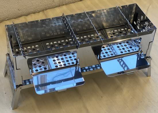 ◆収納サイズ: 約350mm×122mm×18mm ◆組立サイズ: 約384mm×122mm×165mm ◆重量 : 約840g ◆材料 : 0.6mm厚ステンレス・リベット ◆静止耐荷重: 10kg ※火床の深さ: 約7cm ※ロストルは前後側板に渡し宙に浮いた状態になります灰受けの上には絶対に置かないでください。