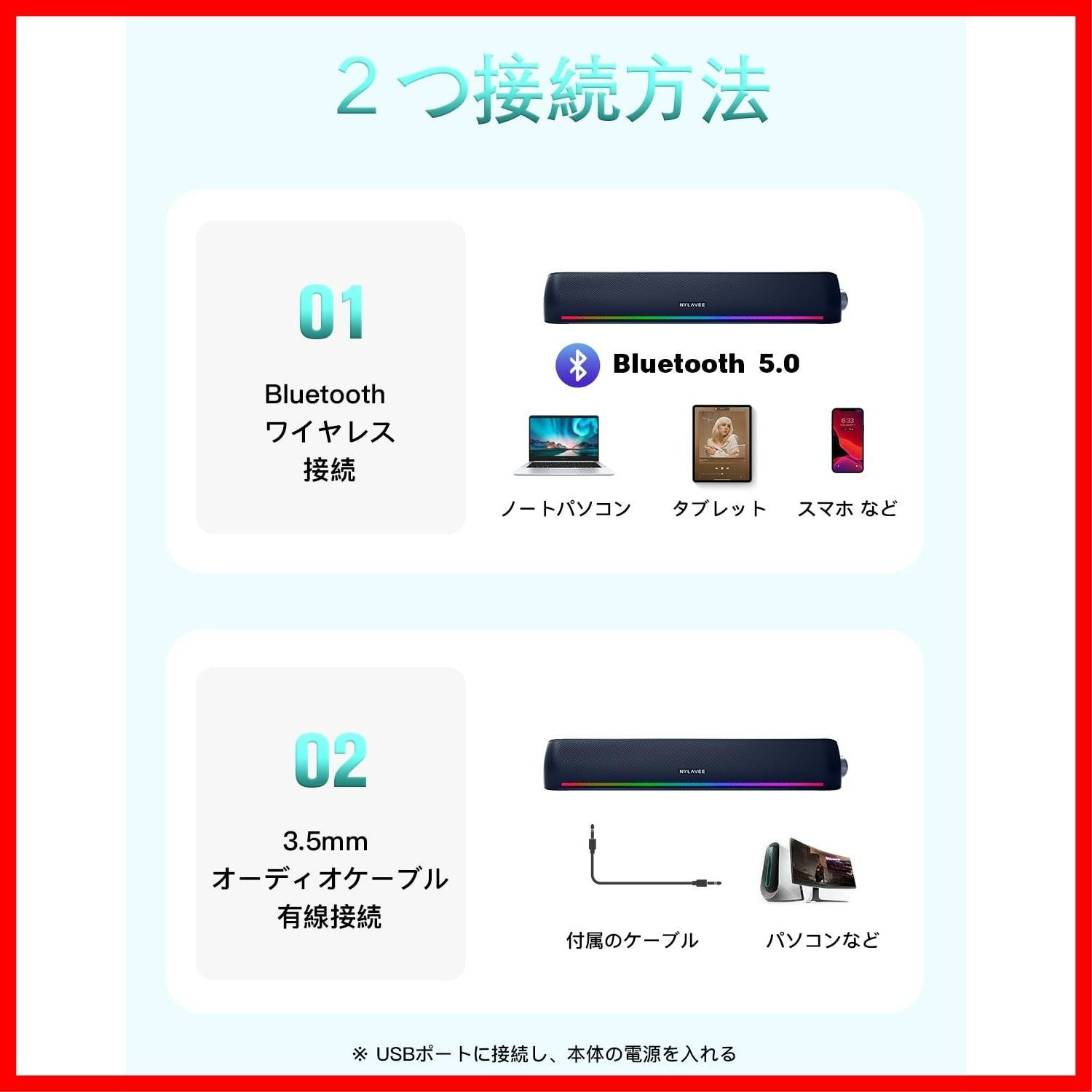 【2つの接続方法】 Nylavee PCスピーカーには、Bluetoothと3.5mmオーディオケーブルの2つ接続方法があります。ノートパソコン、デスクトップ、PC、携帯電話、タブレット、PS4など幅広いデバイスと互換性があります。