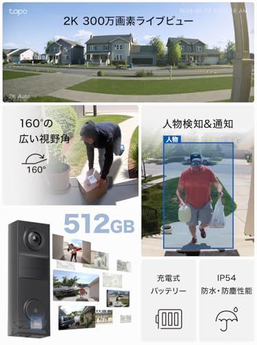 Tapo タポ スマートドアホン ドアホン 工事不要 インターホン ワイヤレス カメラ付きインターホン 2 K 3 MP 300万画素 IP 54 防水防塵 双方向通話 ドアホンコール 人物検知 1年 TP-Link D 205 po c 6 ef 4 eae