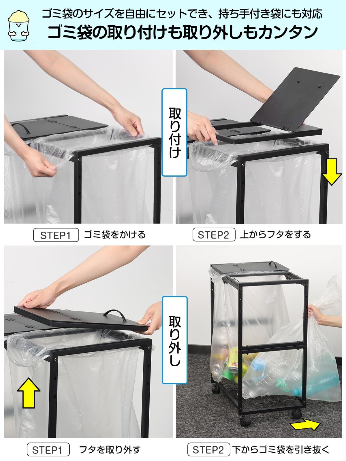 【平袋・U型袋両対応、使い勝手抜群】2025 年 9 月新発売の TTWO ゴミ袋ホルダーシリーズは、業務用平口型ゴミ袋と家庭用取っ手付きレジ袋のどちらも簡単セット可能、とても便利なワゴン型ゴミ箱です。ゴミがパンパンに溜まっても、側面からゴミ袋を取り出せるのでゴミ出しも容易になります。従来のゴミ箱との違いは省スペースなことと、側面や底面が汚れないこと。ゴミ袋ホルダーなら面積が小さいので、汚れにくく掃除も楽です。お手入れのしやすさが人気のポイントです。