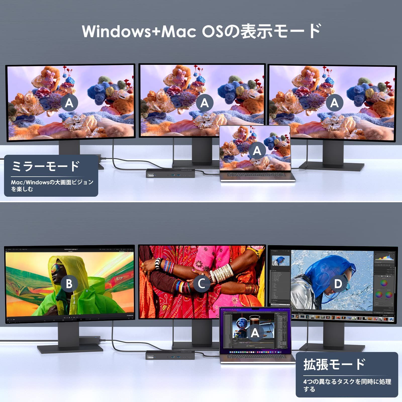 「三重ディスプレイ 4K@60Hz」:5つのビデオインターフェイス(2 ディスプレイポート+2 HDMI+HDMI (Alt Mode))により、3つの外部モニターを同時に表示でき、各画面で異なるコンテンツを表示できるので、マルチタスクが容易になります。DP1.4ソースのもとで最大3840x2160@60Hzのトリプルディスプレイ解像度をサポートします。ご注意:HDMI(Alt Mode)ポートは、ビデオ出力をサポートするために、ノートパソコンのタイプCポートが必要です。