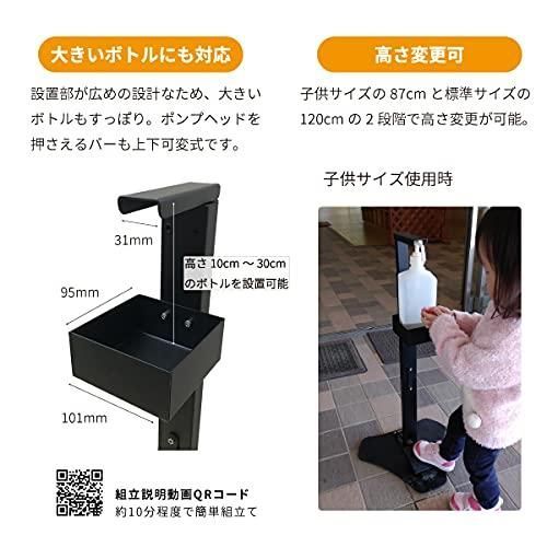 足踏み式で衛生的、ペダルを踏むだけでポンプに触れることなく消毒液を噴射できます。 パーツを一つ減らして、お子様用の背丈にも ・ボトルポンプに触れる必要がないので、不特定多数での使用も安心。 ボトル高:10~30cm設置可能。 8個のパーツを組み立てる簡単設計。約10分ほどの作業で完成します。 期間:1年 ボトル・アルコール液は付属しておりません。