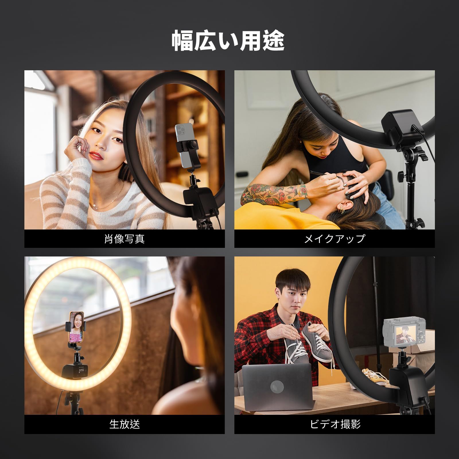 【強力で多用途なリングライト】18インチリングライトは、272個高品質SMD LEDビーズを搭載し、2100ルクス/0.5mの素晴らしい明るさを実現します。0-100% 無段階調光可能、CRI 95+の高演色性により、自然な色再現で美しさを引き立てます。生放送、自撮り、ポートレート写真、商品撮影、映画制作メイクアップ、インタビュー収録、ライブ配信、YouTube/TikTok動画撮影など幅広く対応します。