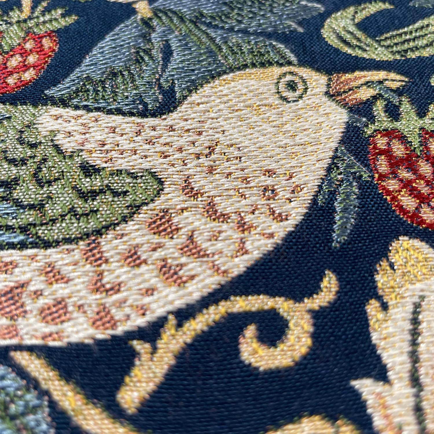 1882年にウィリアム・モリスによって製作され、以来不動の人気を誇るデザイン「いちごどろぼう」の生地を使用した背当てクッションカバーです