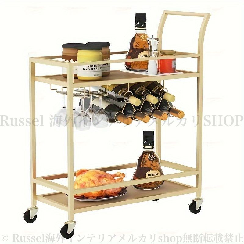 Russel海外インテリア、メルカリshop店のこの手押しカートは、シンプルで洗練されたデザインと多機能性を兼ね備えています。美しいゴールドとクールなブラックの2色展開で、インテリアにもマッチします。