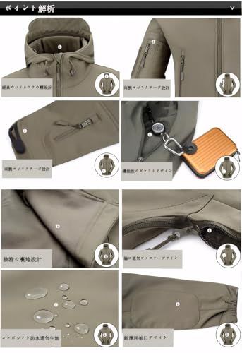 【多機能】?撥水性:撥水加工・防汚処理の生地で、小雨の場合にあって水を問題なく弾いて、ハスの葉効果があります。?防風性・防寒性:隠しフード、袖口と裾の締め付けるデザインははより優れた防風性・防寒性を提供します。?保温性:裏地に肌触り良いボアがあって、室外でも体温をキープします。?ベンチレーション機能もあります。わきの下の通風設計: 大幅に運動した時に、ジッパーを引き開けられて、急速に体内の湿気を発揮できます。?耐久性:丁寧な縫製があって材質感も良くて、長い時間に着用できる一着です。