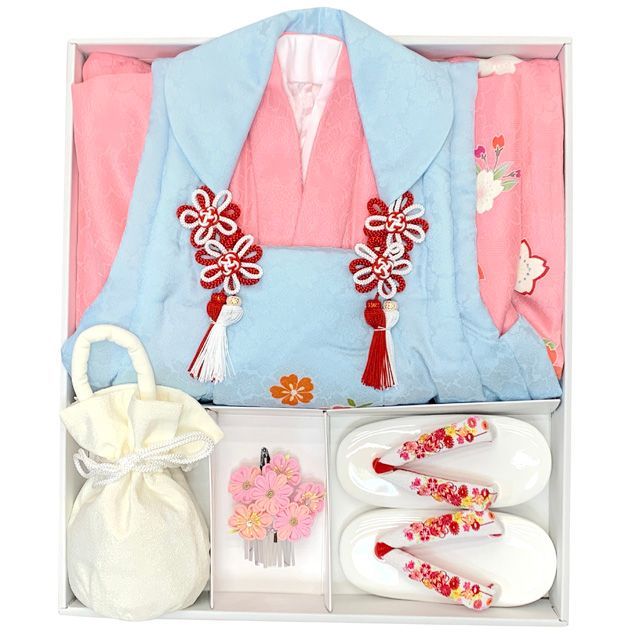 七五三 着物 3歳 正絹 フルセット 女の子 友禅 絵羽柄の着物 被布セット 水色xピンク 鞠と桜 w bBset