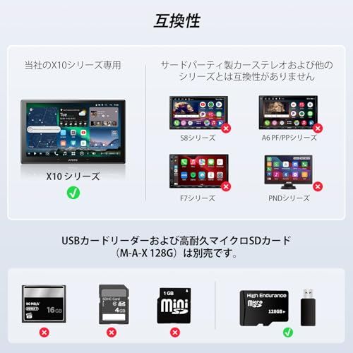 互換性に関するお知らせ:X10シリーズのみ対応、S8、A5、A6 PF/PP、F7、PNDシリーズ、またはサードパーティ製カーオーディオには非対応