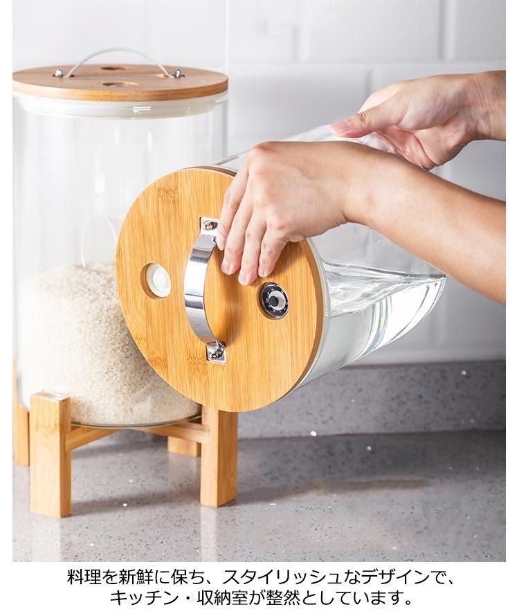 竹製のスタンドが付いた密閉ガラス米びつ。