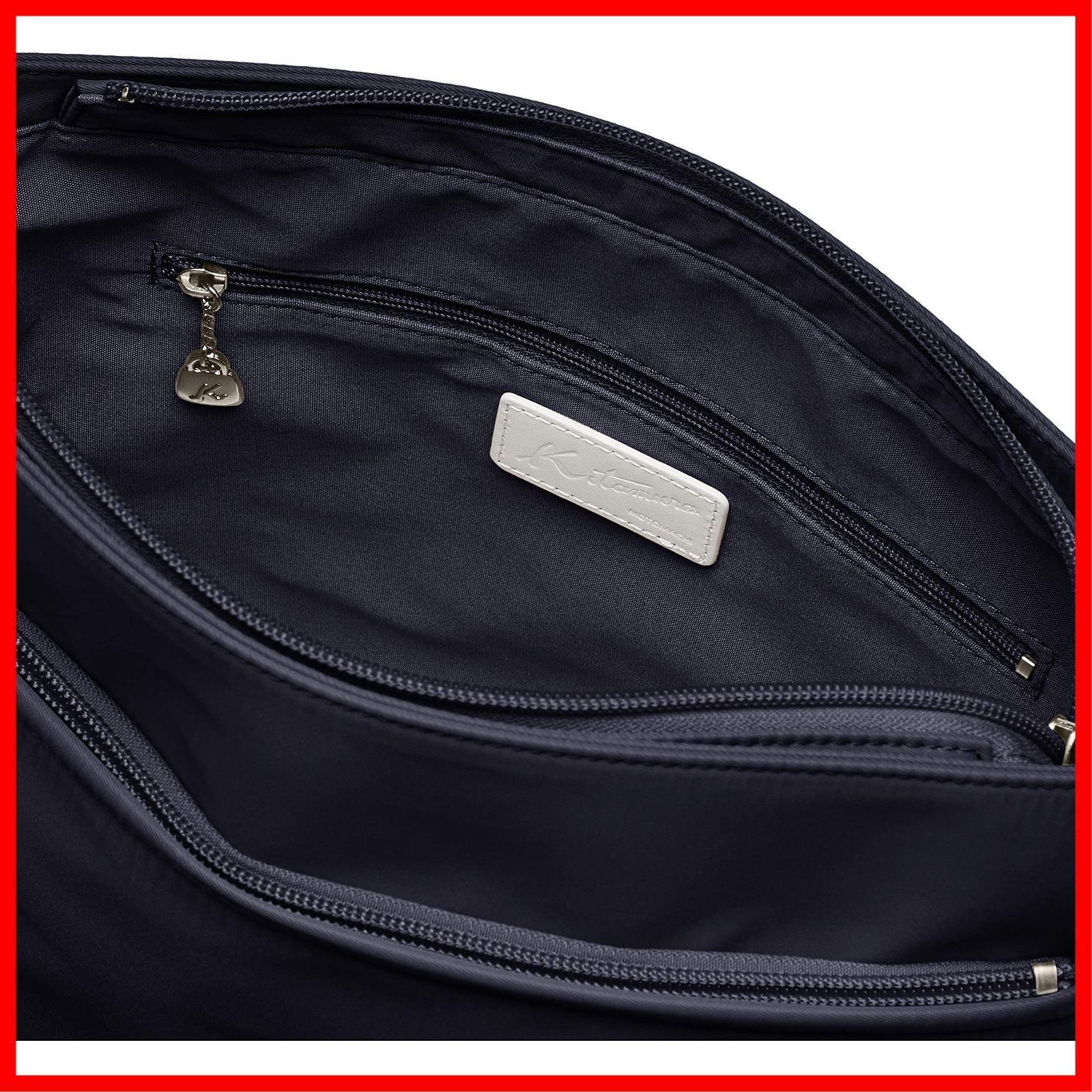ショルダー裏とKマーク刺繍のカラーコンビネーションがポイントのショルダーバッグ。お財布、スマホ、ポーチ、折りたたみ傘など、荷物がしっかりと収納できるサイズ感です。口元は安心感のあるファスナータイプ。ショルダーの長さは調整することができます。