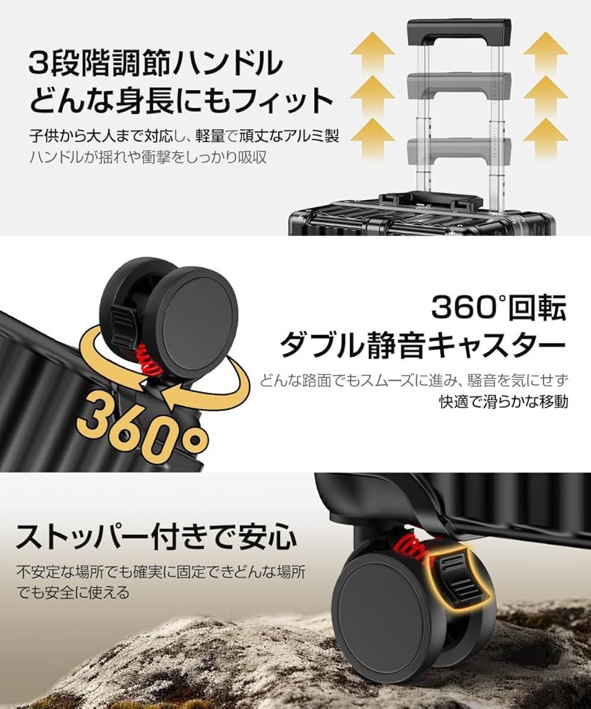 ✅【TSAロック搭載・海外旅行も安心】 スーツケース TSAロックを標準装備しているため、海外旅行でも施錠したまま安心して預けることができます。アメリカ旅行にも対応し、セキュリティ面で優れた保護性能を発揮。海外での移動や出張の際も安心してご利用いただけます。✅【3段階調節ハンドル&360°静音キャスター】 スーツケース の3段階に調節可能なハンドルは、子供から大人までどんな身長の方にもフィットします。 スーツケース 軽量 で頑丈なアルミ製ハンドルは、揺れや衝撃を吸収し、長時間の移動も疲れを感じさせません。また、360°静音キャスターにより、どんな路面でもスムーズに移動でき、騒音を気にせず快適で滑らかな移動が可能です。