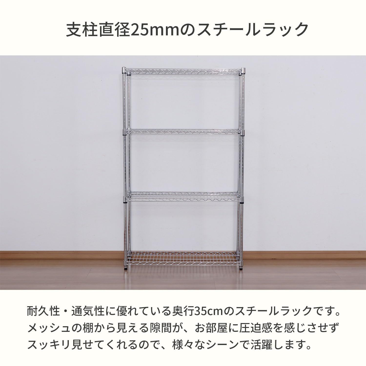 重い物も載せられ、収納力が高い、奥行35cmタイプの支柱直径25mmスチールラック