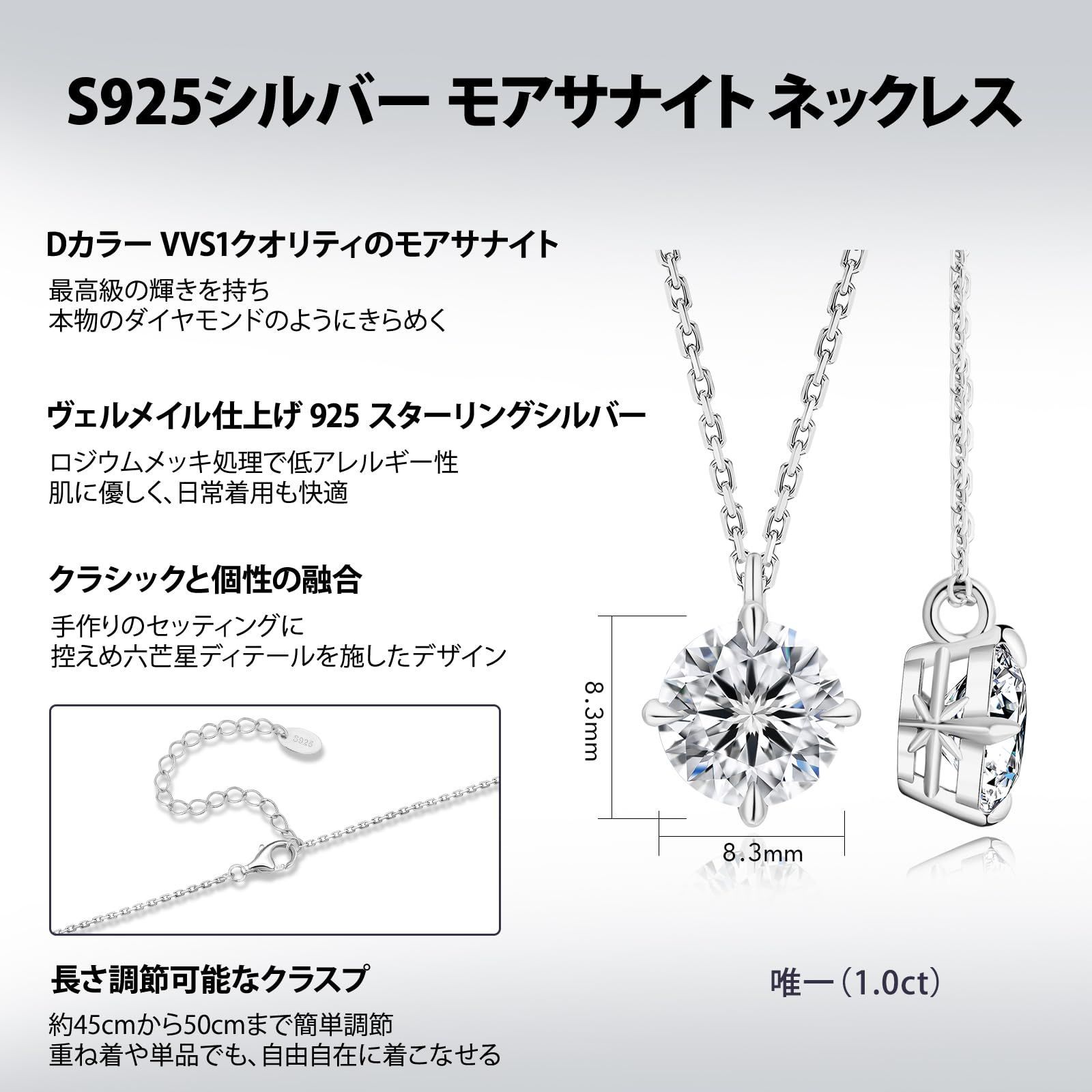 [KRKC] モアサナイト レディースネックレス: S925スターリングシルバー 一粒ダイヤ 0.5/1.0/2.0/3.0/4.0ct 人工ダイヤモンド 4本爪 金属アレルギー対応 ホワイトゴールドメッキ シンプル 人気 女性へのプレゼント 誕生日 ボックス付き 45+5cm 長さ調節