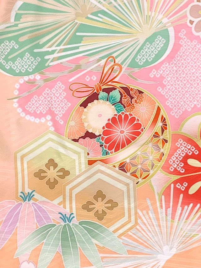 七五三 着物 7歳 女の子 式部浪漫ブランド 絵羽柄の着物 四つ身 子供振袖 合繊 ピーチフィズ 鞠梅 SR 7 pea 2503 tan