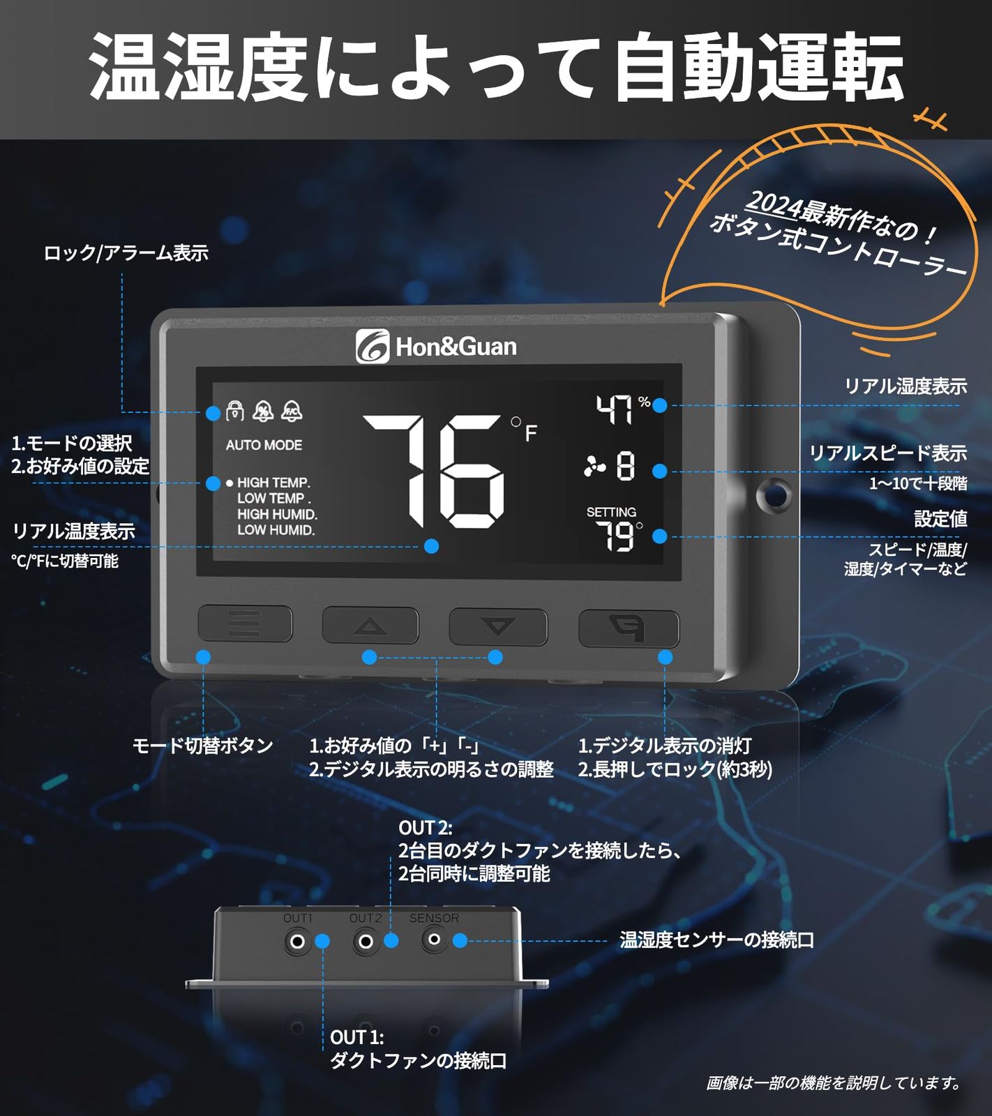 【コントローラーについてより詳しいご説明】簡単に言えれば、三つのモードがあります。1.固定風量段階で運転/2.自動モードで周囲の温湿度にて運転/3.タイマーで運転です。1の場合、温度また湿度にも関わらず、設定した段階で運転し続けます。2の場合、ご希望の最大と最小の温度と湿度値の設定が必要です。設定したらセンサー値によって自動運転します。3の場合、設定したタイマー値で運転し、時間になったら自動にオフします。以外、アラーム値の設定も可能ですこの値になったらコントローラーから鳴り声がします。