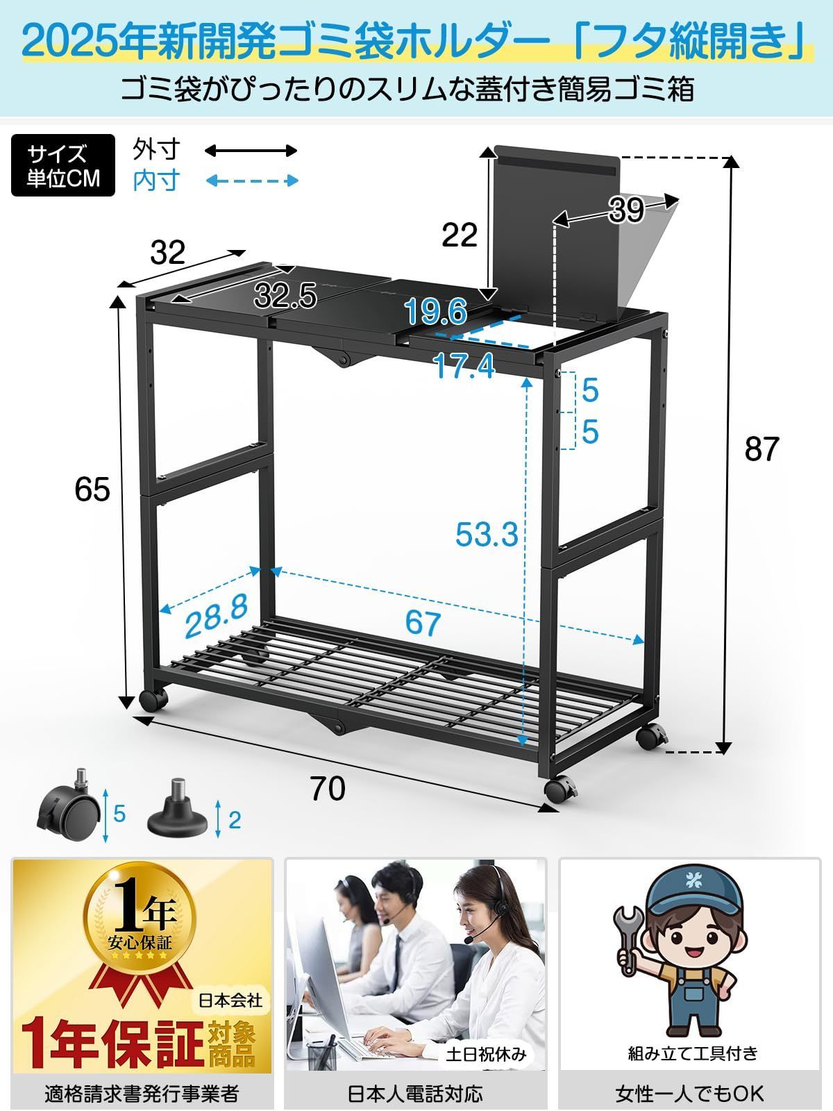 【3連ゴミ袋ホルダー仕様】 サイズキャスター付き:約W70×D32.5×H65cm/アジャスター付き:約W70×D32.5×H61.5cm 各蓋:W20.5×D32.5cm ◎重量:約6.4KG ◎材質:スチール(紛体塗装)対応ゴミ袋:20L~45L。1台で同時に3つのゴミ袋を設置でき、空き缶やびん、ペットボトル、プラスチックなどゴミを分別するのに便利です。