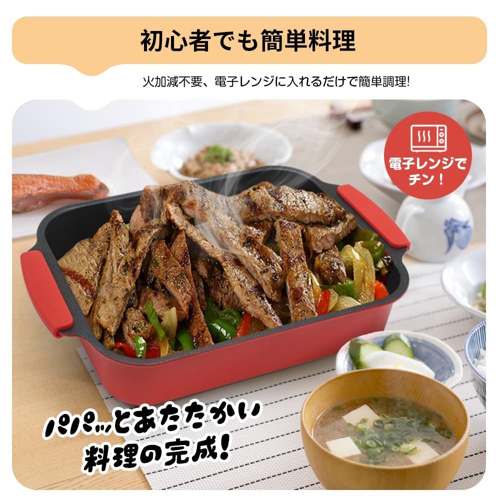 電子レンジ調理器具 レンジパン レンジで焼き魚 レンジで焼肉 電子レンジで美味しく安全に調理できる鍋 フッ素コーテイング レシピ&取り扱い説明書付き 赤