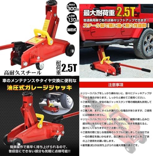 アルミジャッキ:油圧式ガレージジャッキ,全長約71cm幅13.5cm【能力】:2.5t。【最高位】:約300mm【最低位】:約130mm,【重量】:約9kg【材質】:スチール