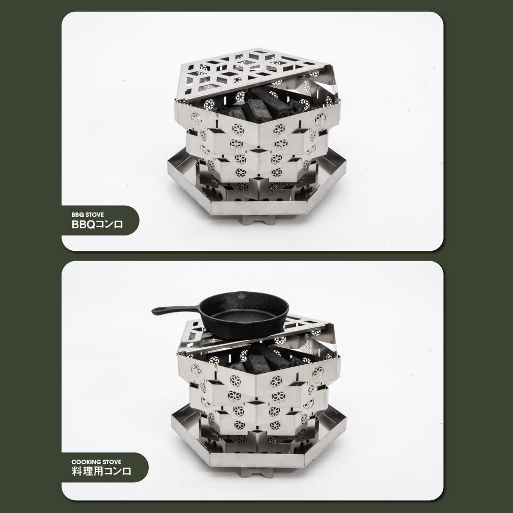 【高い燃焼効率/BBQコンロ】表面の模様、六角部分の隙間は空気孔となり燃焼効率を高めます。天面には半面サイズの網目グリル台が付属され、ケルトでお湯を沸かし、BBQや調理ができます。半面スペースは薪の出し入れ用。焼き網(別売り)を載せれば直火焼きが楽しめます。