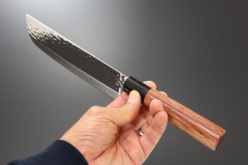 ハンドルは和式の美しい木目調の赤合板材を使用、ブレードは洋式の和洋折衷の包丁。サビにも強い、よく切れて高い定評のあるステンレス特殊鋼DSR-1K6(全ステン)を採用。槌目加工による凹凸は、風合いが美しく、食材の切り離れを助け、切れ味を助長。耐水性にも優れた赤合板丸柄は、握った感じも手に心地よく、鋭い切れ味とメンテナンスの良さを兼ね備えた包丁。信頼の兼常作。柄材 赤合板/プラスティック桂