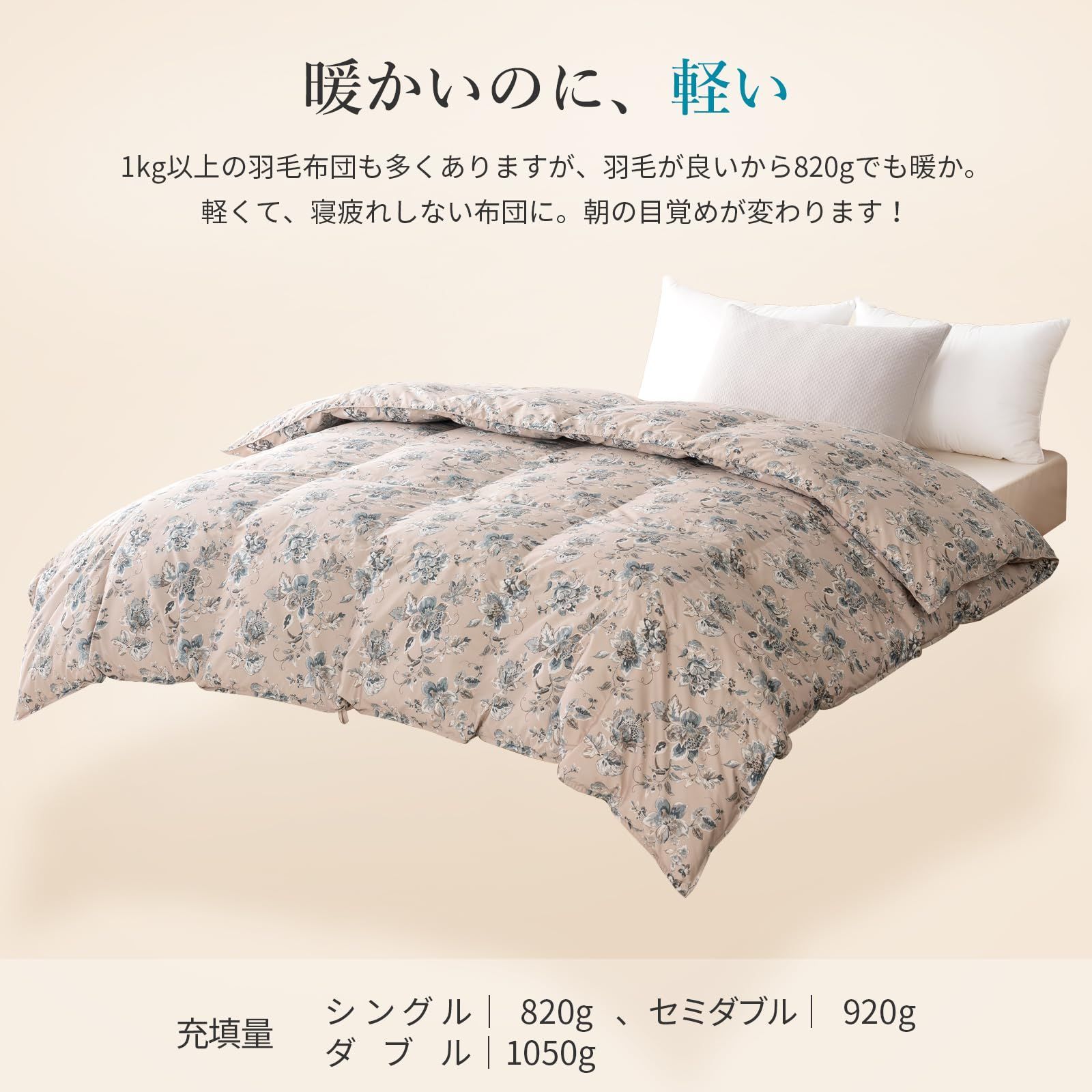 AIFY フレッシュダウン 羽毛布団 シングル ホワイトダックダウン85% 羽毛たっぷり 掛け布団 ふわふわ 暖かい ダウンパワー370 立体キルト 冬 軽量 通気性 吸湿 発熱 保温 抗菌 防臭 防ダニ OEKO-TEX認証 充填量0.82kg 150×210cm 花柄