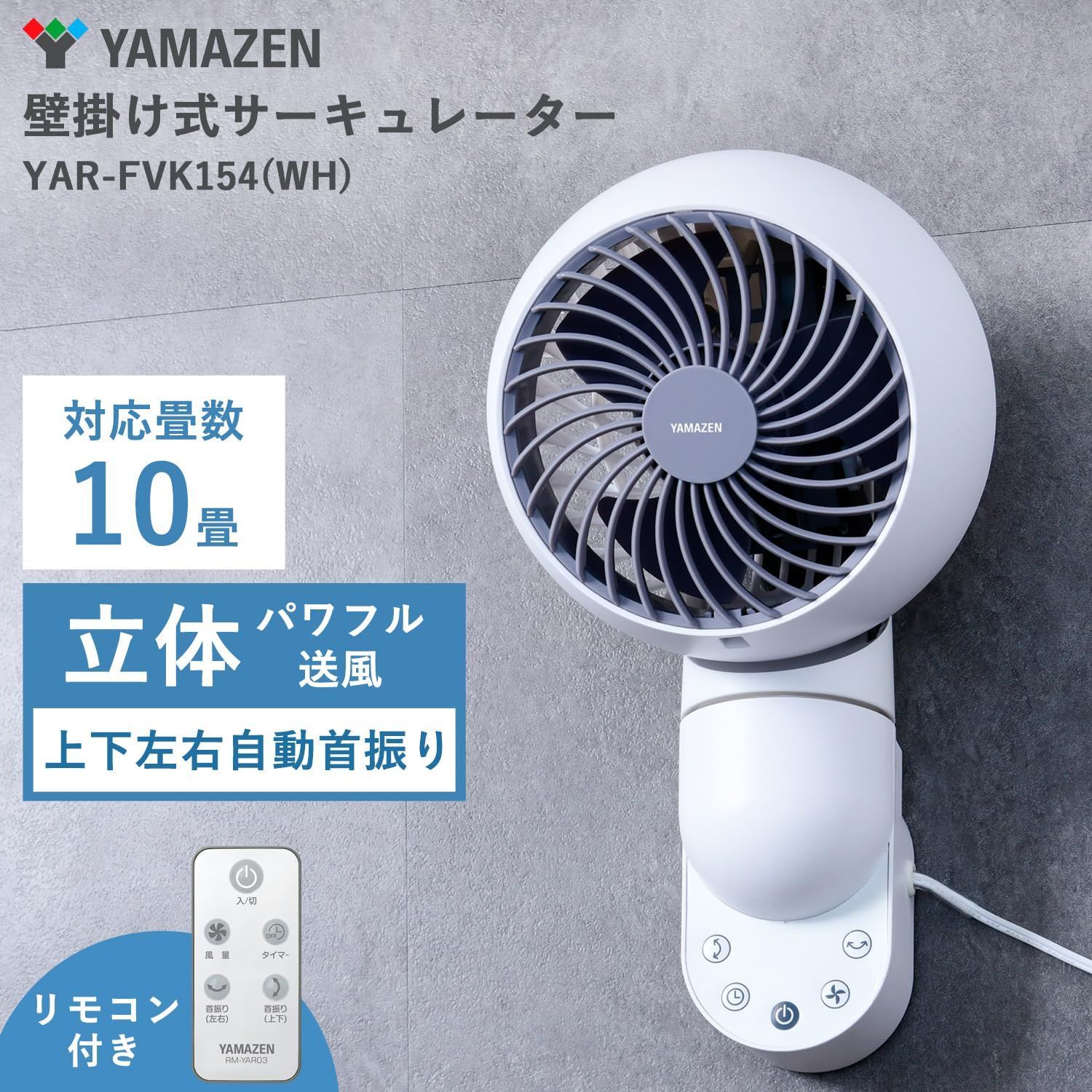 山善 壁掛式 サーキュレーター 静音 10畳 上下左右自動首振り タイマー付き 風量3段階調節 リモコン付き お手入れ簡単 ホワイトグレー YAR FVK 154 WH