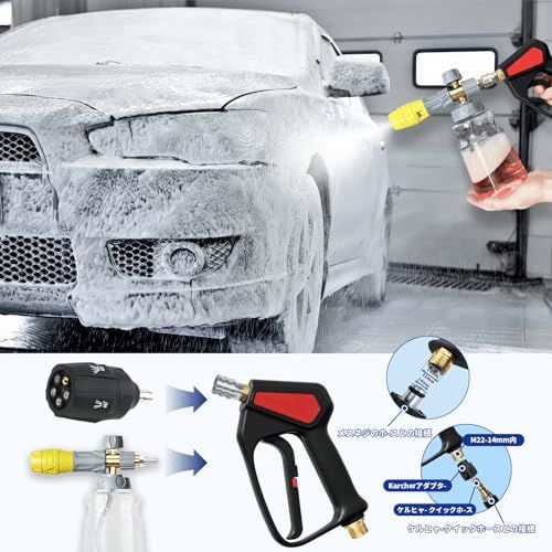 【2025新世代フォームガン】Akitsubaケルヒャーショートガン用フォームガンはオリジナル な配色と型、すべでのガンに似合います。より高品質な材料を使用、精密に製 造された合金製インジェクターでより長く使用でき、透明なポット本体はボト ル内の液体がはっきりと見え、いつでもどこでもボトル内の液体容量が分かり ます。更に、瓶口が大きいため、石鹸水の注入が易い。ボトル容量:1000ml( 1L);最高水温:80。Akitsubaフォームキャノンは泡の大きさを調整できます。 Akitsubaフォームガンは従来の洗車機に比べ、スワールマークや傷の少ない濃 厚な泡を作ることができ、洗車に役立ちます。または、本フォームガンは追加 オリフィスノズルがあって、2500 PSI に未満でも厚い泡を作り出します。【使用方法】 1.アダプタをフォームランスユニットに取り付けます。2. 液体ボトルにカーシャンプー30%水70%の割合で入れます(シャンプーの
