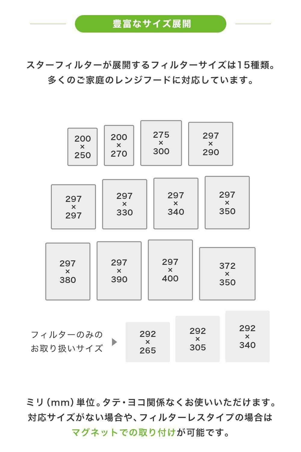 【入れ替えるだけの簡単お手入れ】多くのご家庭のレンジフードに備え付けられている金属フィルターをスターフィルターに取り替えて設置は完了です。これだけで換気扇のきれいが長持ちし、お手入れが劇的にラクに。フィルターレスタイプの場合はマグネットで取り付けられます。