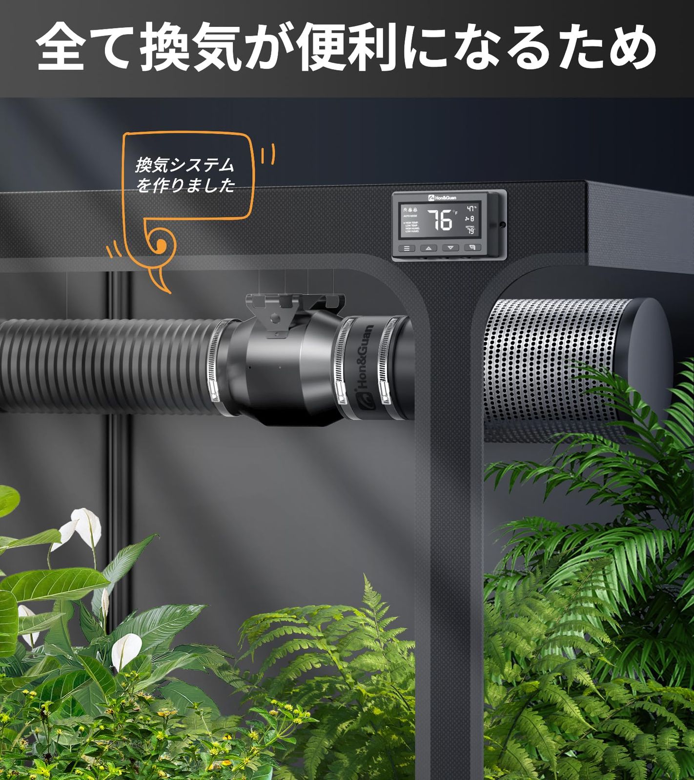 【今までのない一品!センサーで自動動作】今までお客様から様々なご意見を頂き、「スマートに換気」を注目し、新しい使い方をデザインしました。一度コントローラーにでご希望の温度また湿度を細かく設定し、そしてご希望の最大と最小値も設定し、センサー周囲の温度湿度が設定値範囲外になったら、自動に換気が始まります。一度設定したらかなり楽になるのでしょう。また、コントローラーの表示はデジタルなので、見えやすいし、リアル表示もあるので今周囲の状況も確認しやかったです。