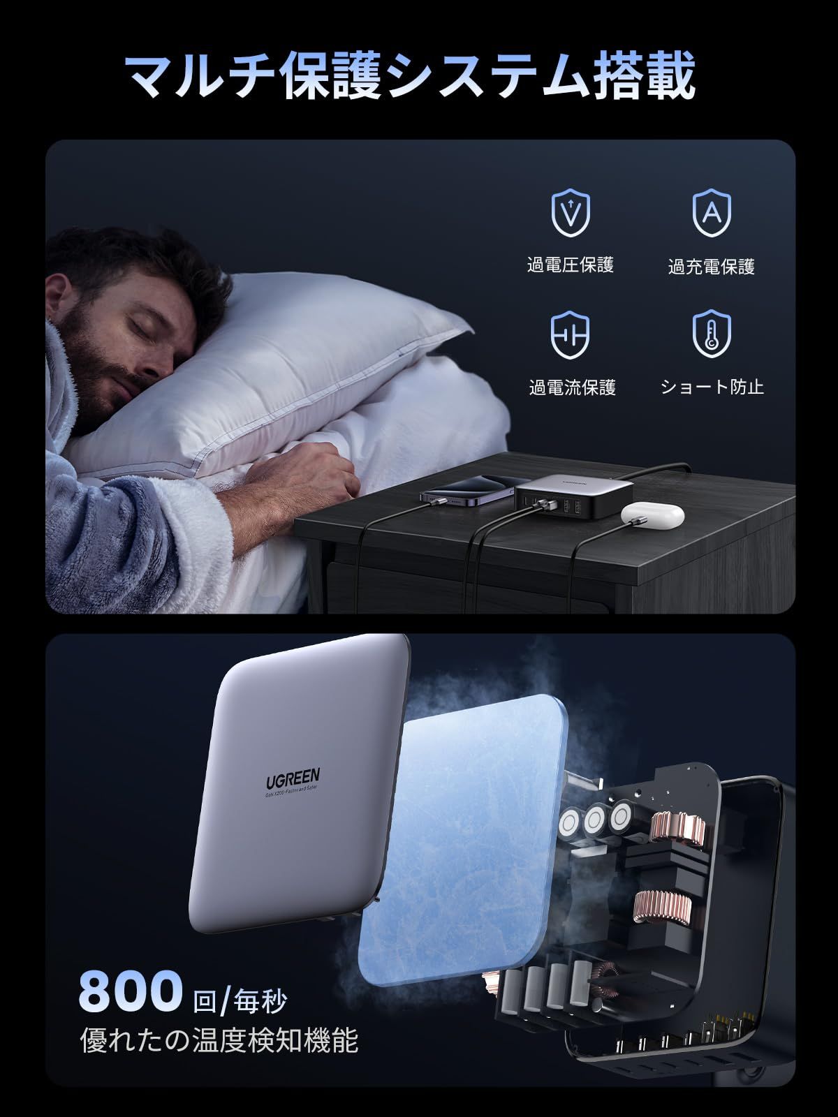 【多重な安全保護機能】本体に耐火PC素材を採用外部からの熱の遮断して過熱に心配する必要なして使える。過電流、過電圧、過熱、短絡などをしっかり防ぎ、急速かつ安全な充電を実現する(PSEなど電気安全に関する認証を取済み)。更に、安全保護システムにて毎秒800回の温度測定を行いまして、過発熱の問題を解消しデバイスとも家族ともちゃんと守る .