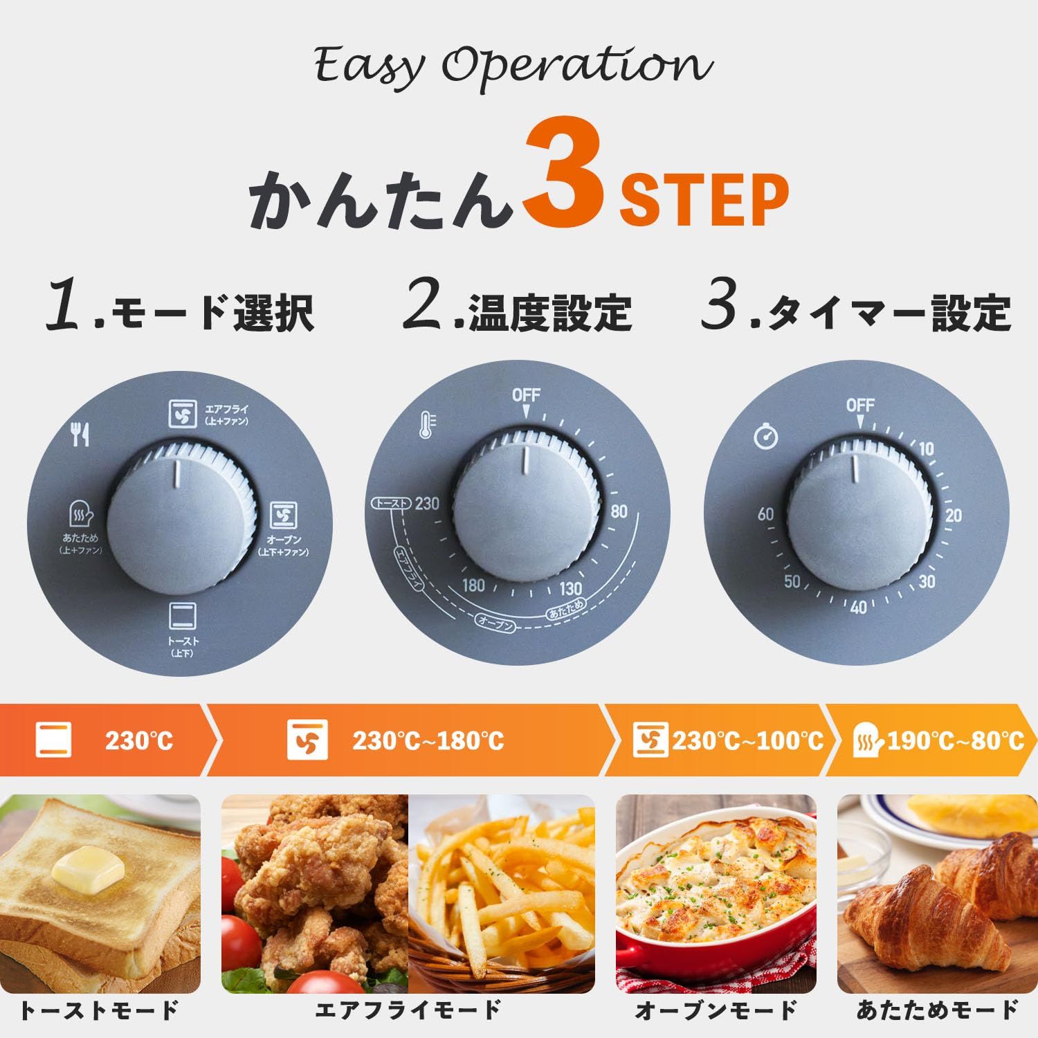 【簡単シンプル操作】操作は「モードダイヤル」「温度調節ダイヤル」「タイマーダイヤル」の3つで完結します。ファンや上下ヒーターの使用有無がわかるアイコンが記載された「モードダイヤル」、選択モードに合った温度の設定範囲が記載された「温度調節ダイヤル」により、簡単に調理に合わせた設定が行えます。