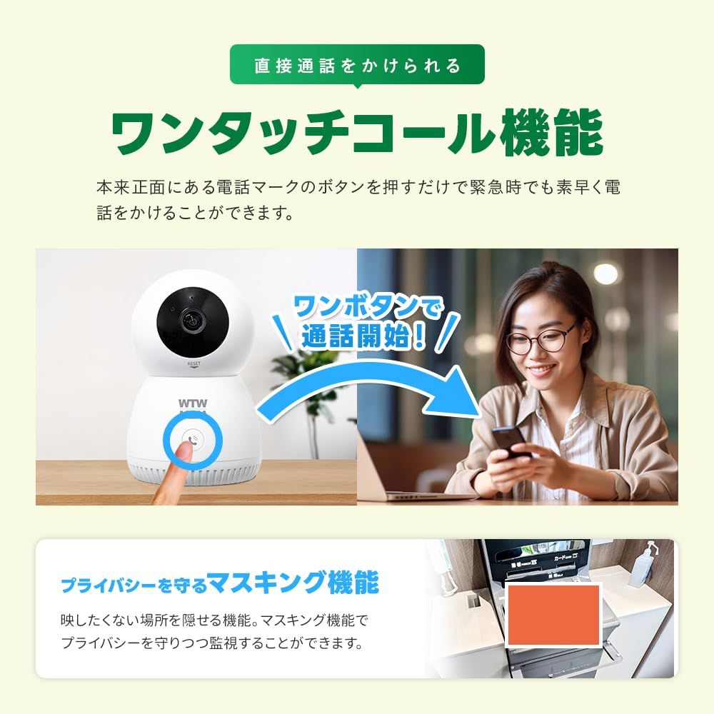 【500万画素の高画質撮影】 一般的な見守りカメラよりも高画質な500万画素を採用。 表情まではっきりと映るクリアな映像をご覧いただけます。 【スマホアプリでどこからでも監視】 専用アプリで外出先から リアルタイムの映像をいつでも見ることができます。 アプリから過去の映像を再生することも可能です。