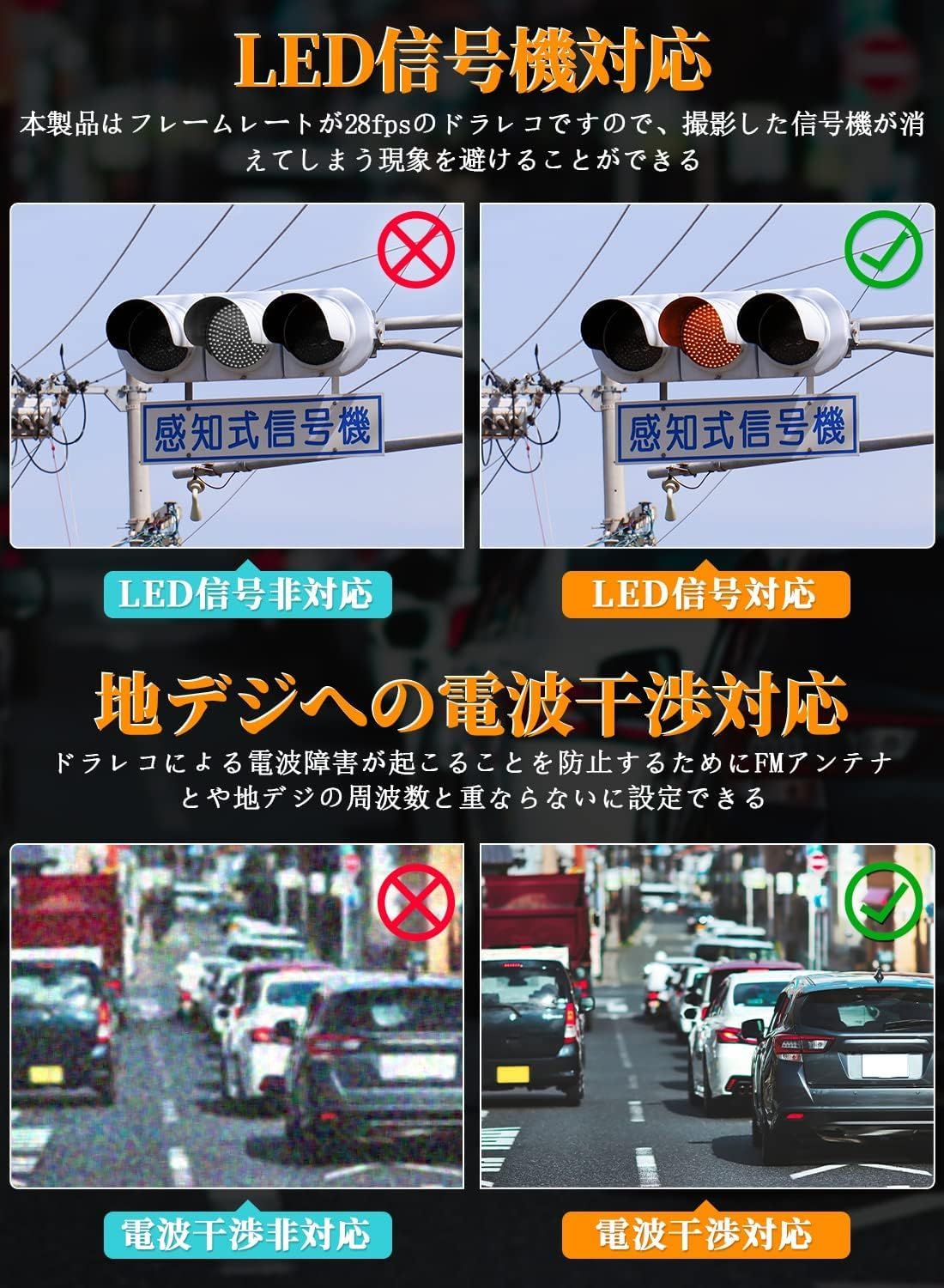 【スライド式フロントカメラ+右ハンドル用カメラのデザイン+LED信号機/地デジへ干渉対応】 ?新型のスライド式フロントカメラを搭載しており、従来のドラレコに比べて、柔軟に調整可能で取り付けがより容易になります。カメラは上下左右の微調整が可能です。スライドで調整できるカメラの距離は左右3cmです。 撮影範囲が従来品に比べ20%拡大し、視野が広げることで安全で快適なドライブをサポートします。?本製品は日本仕様で左側を通行する車両に適した右ハンドル用カメラを搭載しております。 カメラが右側ハンドル仕様でない場合、視野の一部が死角となり、撮影することができません。右側仕様で従来のドラレコよりも右側の死角を作りません。?本製品はフレームレートが27.5fpsのドラレコですので、東日本と西日本のLED信号機の場合でも、撮影した信号機が消えてしまう現象を避けることができます。ドラレコによる電波障害が起こることを防止するために、FMアンテナとや地デジの周波数と重ならないに設計しています。