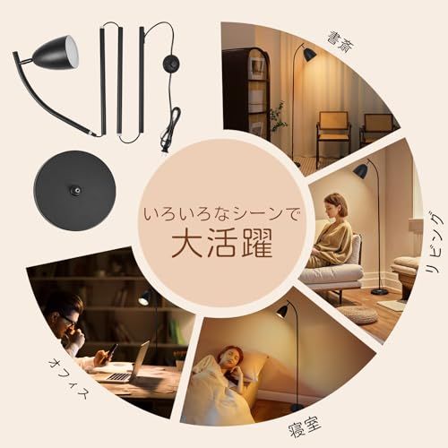 【広範囲を照らせる・おしゃれな空間を演出&さまざまなシーンに大活躍】広範囲を照らすスリムデザインのフロアライト。シェードは360回転可能で、無段階調光調色機能とフットスイッチ付き。スペースを取らず、書斎、リビング、寝室など多様な場所で活躍。