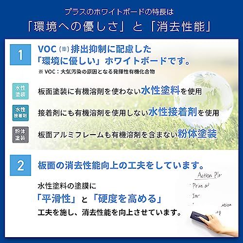 VOC排出抑制に配慮した環境に優しいホワイトボードです。また、従来のプラスのホワイトボードよりフレームの段差が少ない、スッキリとした形になりました。