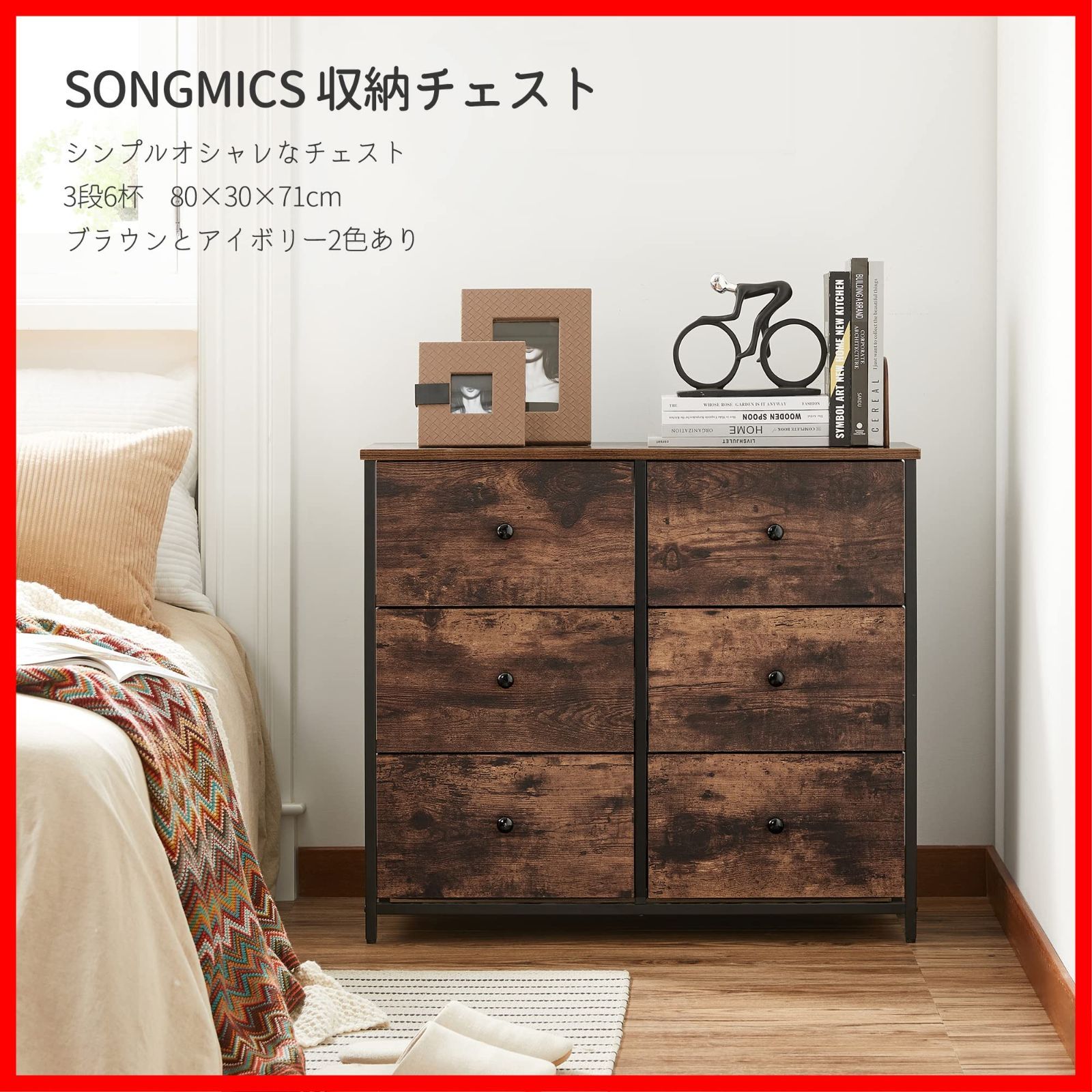 SONGMICS 収納チェスト衣類収納チェスト 3段6杯 木製 おしゃれ ヴィンテージ風 タンス オシャレ 布製引き出し キャビネット 衣類収納 リビング収納 低ホルム 組立簡単 幅80×奥行30×高さ71cm LGS23H