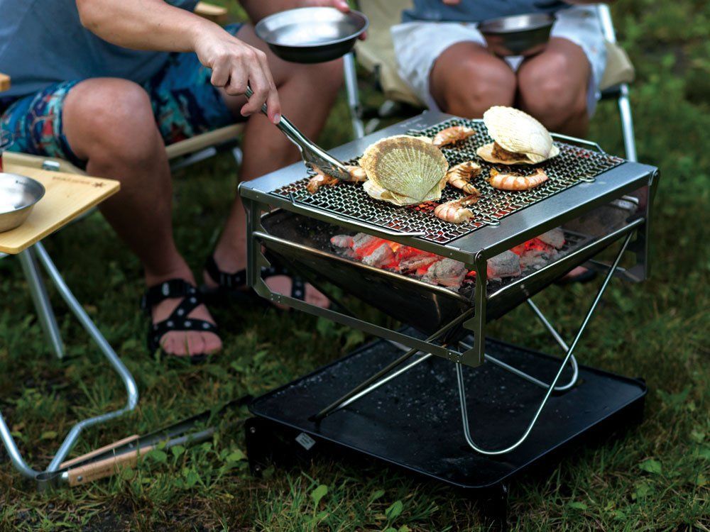 焚火台LにグリルブリッジLをセットすることで、グリルネットやグリルプレートなど調理用オプションを使うことができます。3段階の高さ調整で、火加減をコントロールできます。