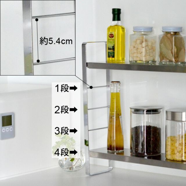 下の段は4段階で調整可能なので、調味料や瓶の高さに合わせてお好みで調整可能です。