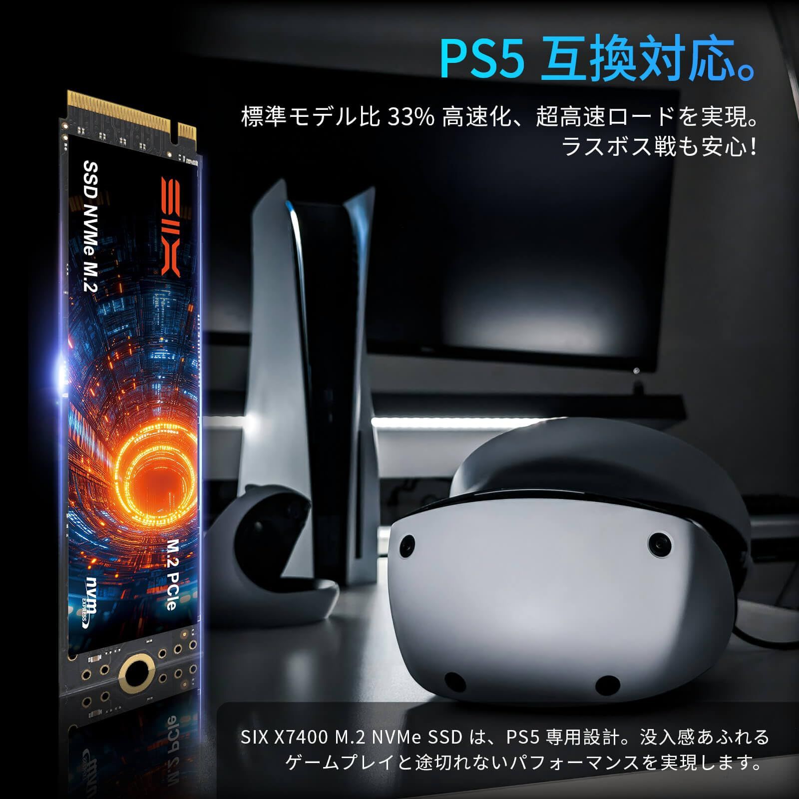 究極のゲーミング設計 - SIX X7400 M.2 NVMe SSD PS5版は、没入感のあるプレイ、途切れないゲーム体験、驚異的な短縮ロード時間を実現。息を吸って、集中、吐いて。X7400の電撃的ロード速度が、ラスボス戦にあなたを導く